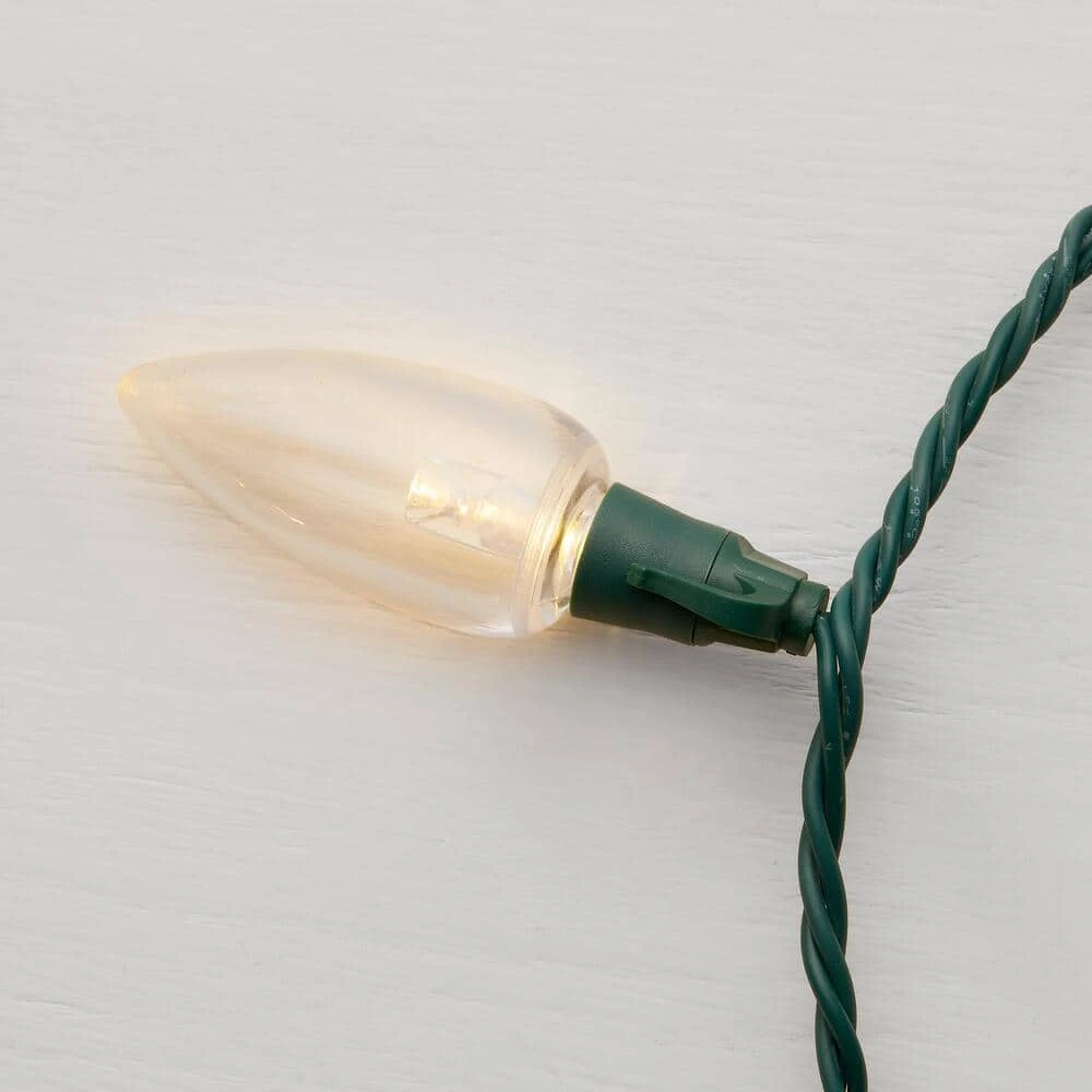 Deck your holiday halls with this 100-light transparent warm white C9 LED light string. 100 energy efficient LEDs remain cool to the touch and cast a warm radiance that welcomes the winter and your visitors, while the versatile design supports a range of decorating options inside and outside your home. Boasting a generous length, this 100-light transparent warm white C9 LED light string lets you brighten up your balcony, mantel or staircase with a gorgeous luminous glow.