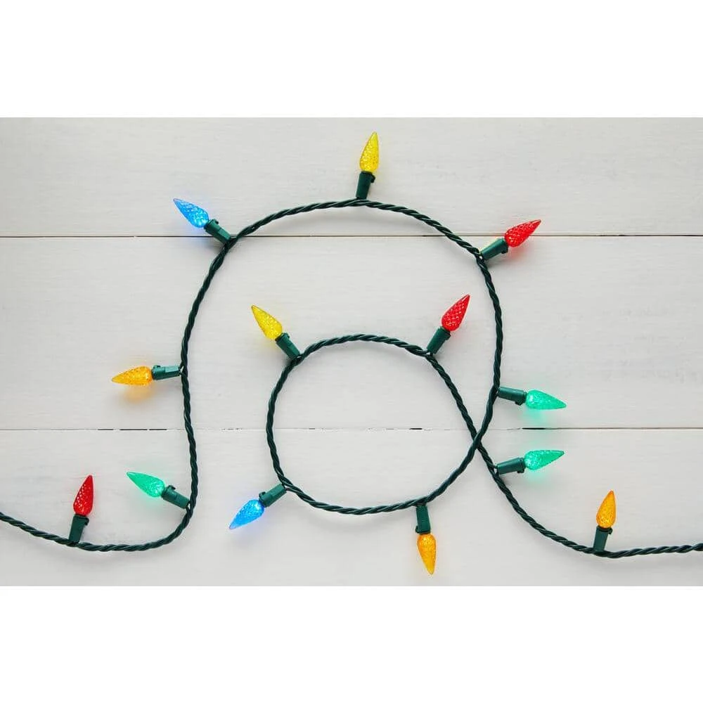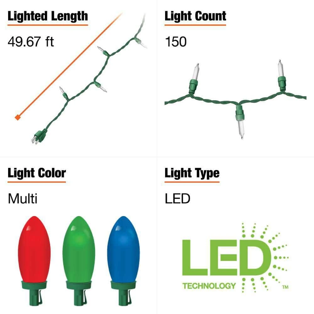 Illuminate your holiday decor with this 150-light multicolor C6 LED string light set. The bright bulbs bring lively hues to your living room or porch for a jolly appearance, while the 49.6-foot length makes it simple to trim your trees or light up your windows with Christmas cheer. A versatile design supports indoor and outdoor use for a generous array of placement options. Using continuous-on technology, this 150-light multicolor C6 LED string light set keeps the joy shimmering throughout the season.