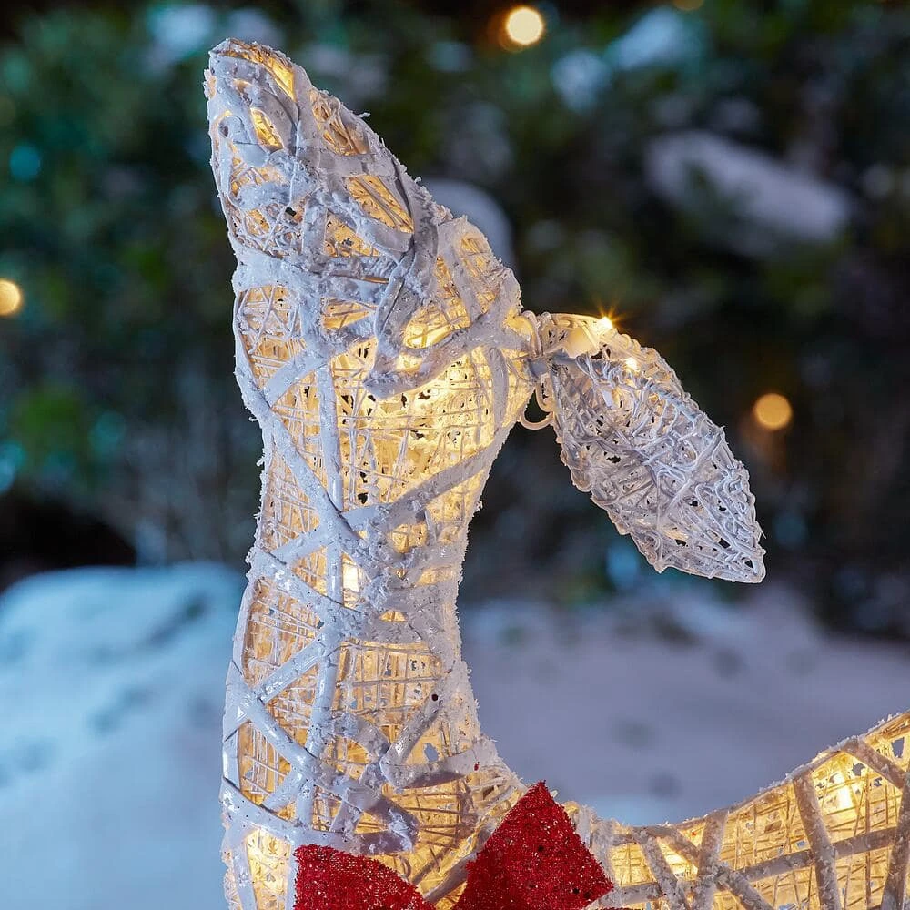 Turn your front yard into a peaceful woodland scene with this two-piece Polar Wishes white deer set. LED lights twinkle in the dark, welcoming neighbors and guests to come visit, while sturdy metal frames and durable weather-resistant fabric can handle winter storms and winds. Simply secure with the included stakes for a lasting Christmas display. Extra bulbs and fuses ensure these darling deer last through season after season of use. Rated for both indoors and out, this Polar Wishes white deer set provides versatile use throughout your space.