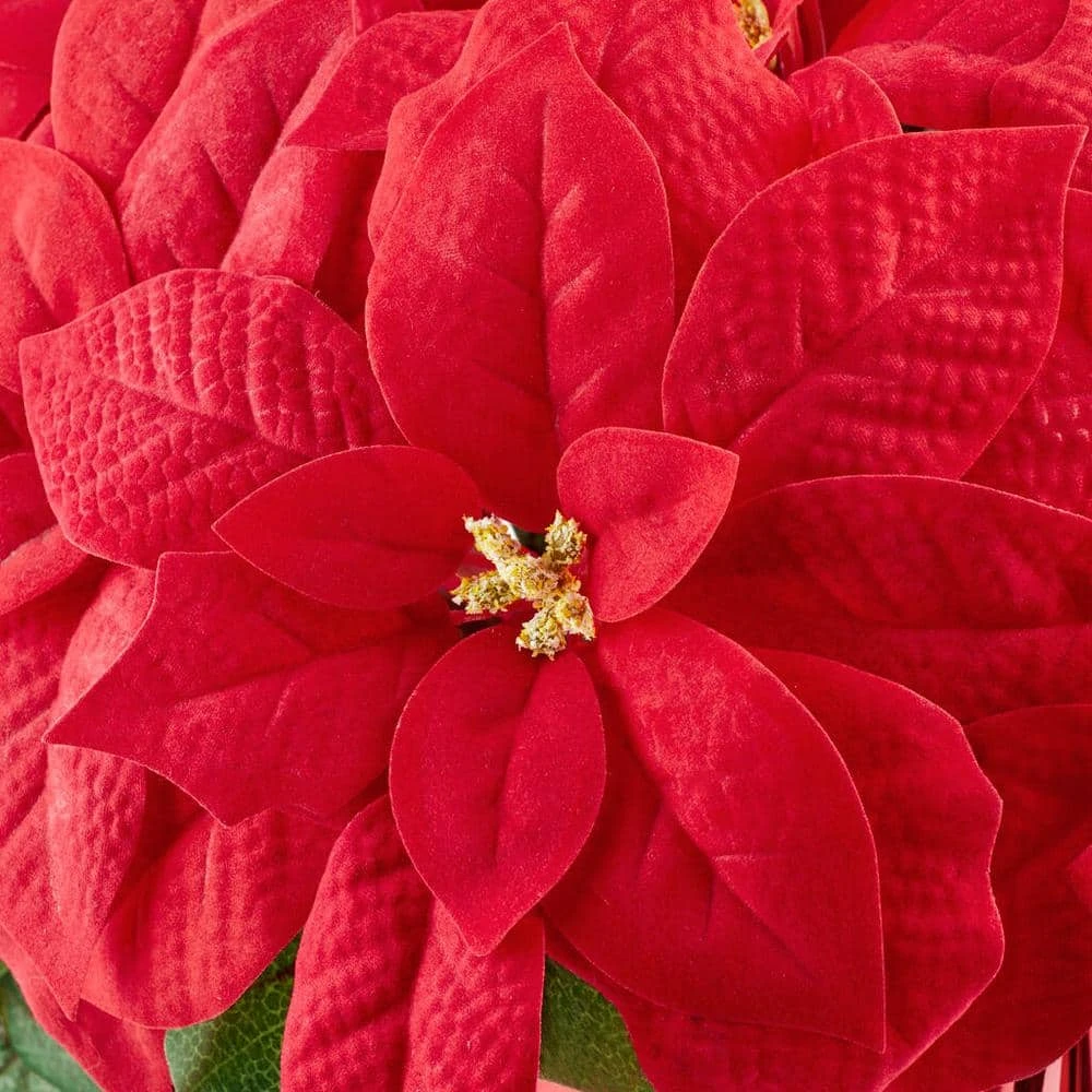 Perk up your holiday decor with this artificial poinsettia floral arrangement. The generous size stands out as a centerpiece or accents your table decor. Eleven polyester silk blooms create a full, realistic appearance for a lively look without the need for water or sun, while the foil-wrapped base offers effortless indoor placement on a desk, shelf or table. Featuring vibrant red hues, this artificial poinsettia floral arrangement helps make your yuletide merry and bright.