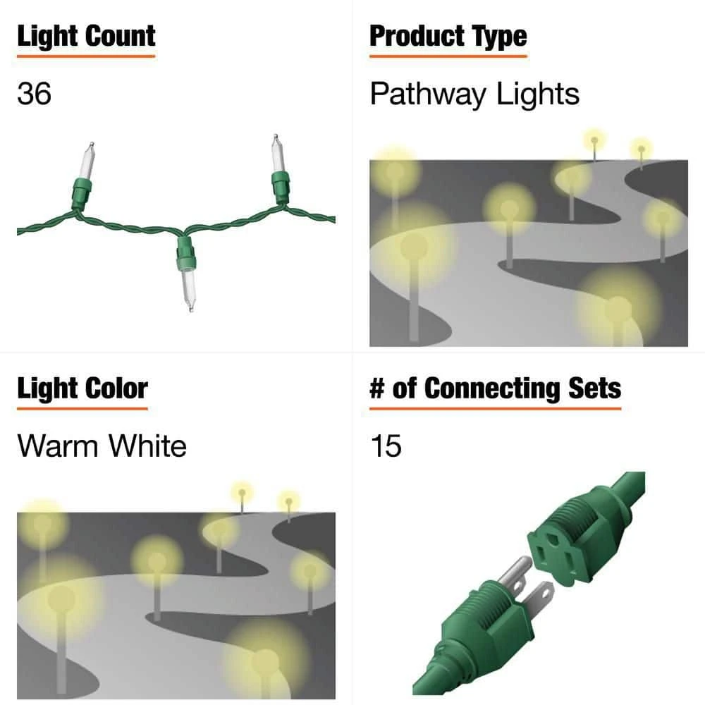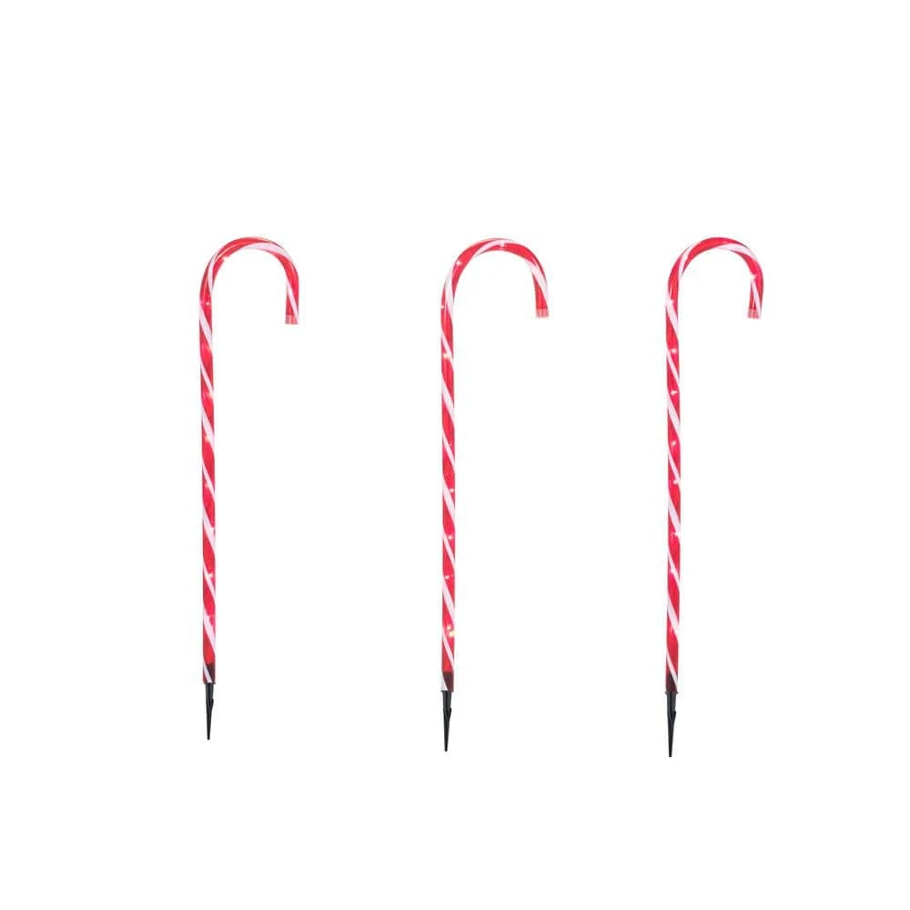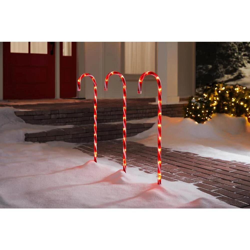 Guide your guests to sweet holiday celebrations with this pack of three 27-inch Home Accents Holiday candy cane pathway lights. The red and white candy canes complement a classic Christmas palette, capping off traditional holiday decor. Featuring 36 clear mini bulbs, these pretty pathlights offer radiant illumination. The easy-to-install construction supports a hassle-free holiday. At 27 inches high, these Home Accents Holiday candy cane pathway lights make it easy to line our walk or create brilliant illumination along your drive or around your patio.