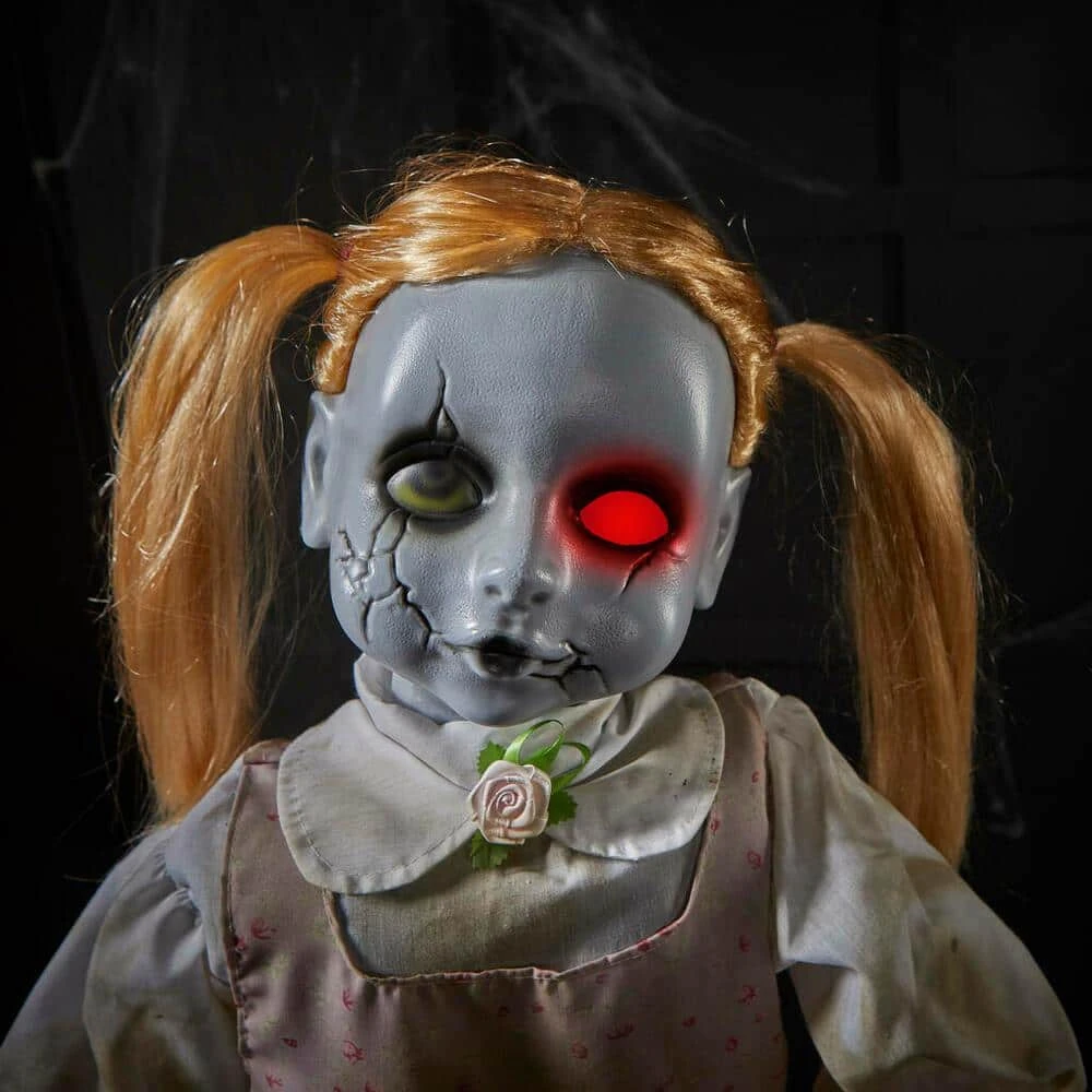 Set up a fun and shriek-worthy Halloween display with this 3-foot animated LED haunted doll. With a tattered teddy bear in her hand, this figure sports a well-groomed blonde hair and neat pink dress that stand in stark contrast with her glowing red eyes. Bright red LEDs help the eyes stand out, heightening a creepy ambience. Her head and hands move in sync with the spine-tingling sound recording to entertain and spook your guests. This battery-powered animated LED haunted doll features sound sensor activation for goosebump-inducing Halloween pranks.