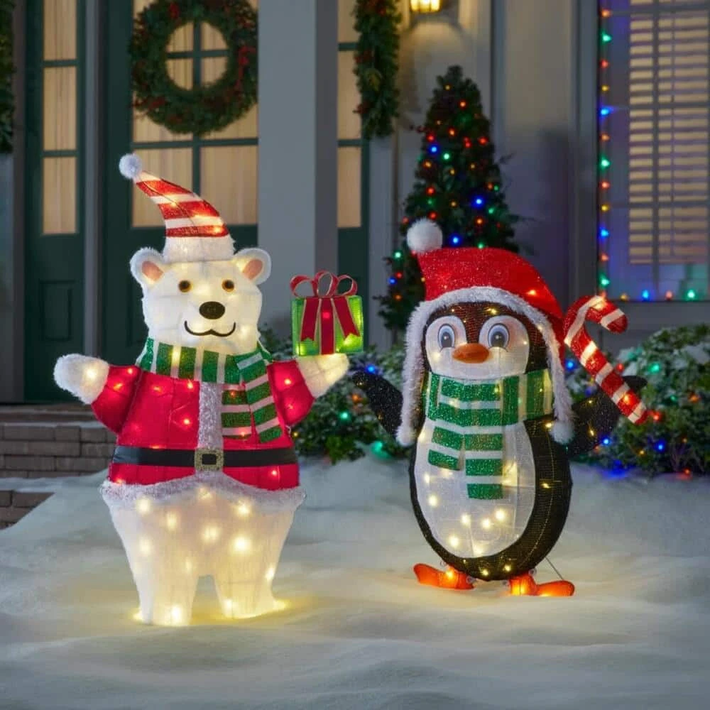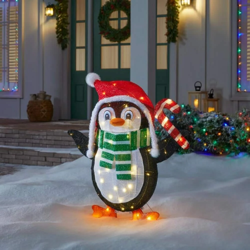 Welcome the most wonderful time of the year with this tinsel LED cute penguin. The red Santa hat, green winter scarf and red candy cane provide colorful, eye-catching additions to your cheery Christmas yard decor. Warm white LEDs cast a festive glow, while the included stakes and stand enable a quick, secure outdoor installation. At 36 inches high, this tinsel LED cute penguin pairs well with your Santa Claus, reindeer and snowman figures for a fun custom scene.