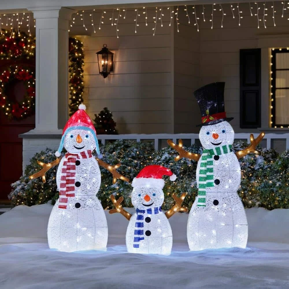 Walk through a winter wonderland when you set up this tinsel snowman family yard sculpture set. The 3 snowman add a nature-inspired touch to your outdoor display and the sparkling LEDs deliver a touch of twinkle for a merry appearance. This set features a neutral white color and tinsel accents to coordinate with an array of other lawn decor-pieces. With a simple design, this tinsel snowman family yard sculpture set offers easy assembly.