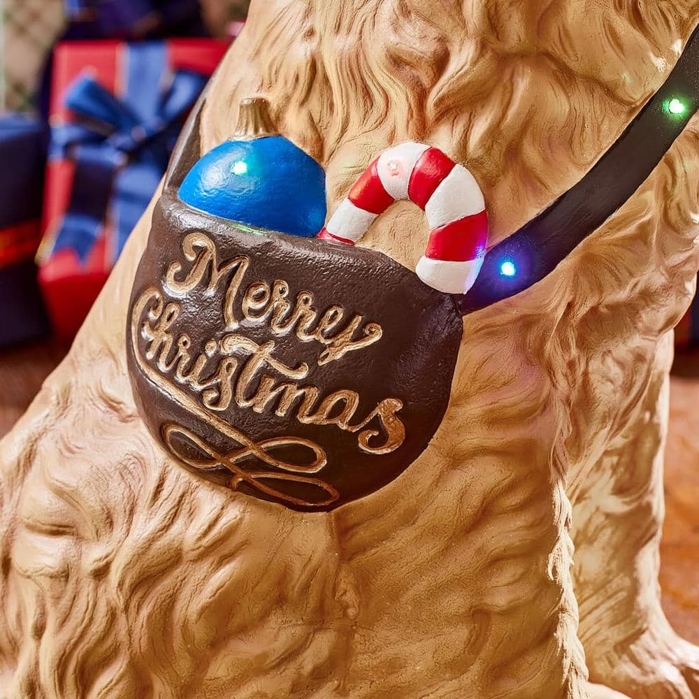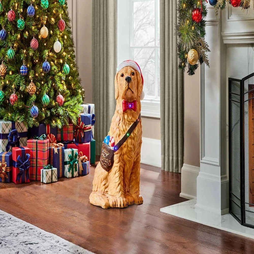 Ring in the holidays with this Christmas golden retriever statue. Decked in a Santa hat and red tie, this delightful canine is festively dressed to welcome guests to your home, and the battery-operated design pairs simple operation with flexible placement options. The 30-inch profile presents a life-size design, making it an ideal option to pair with garlands and string lights. Beautifully hand-painted, this Christmas golden retriever statue adds a pop of color and artistic flair to your decor.