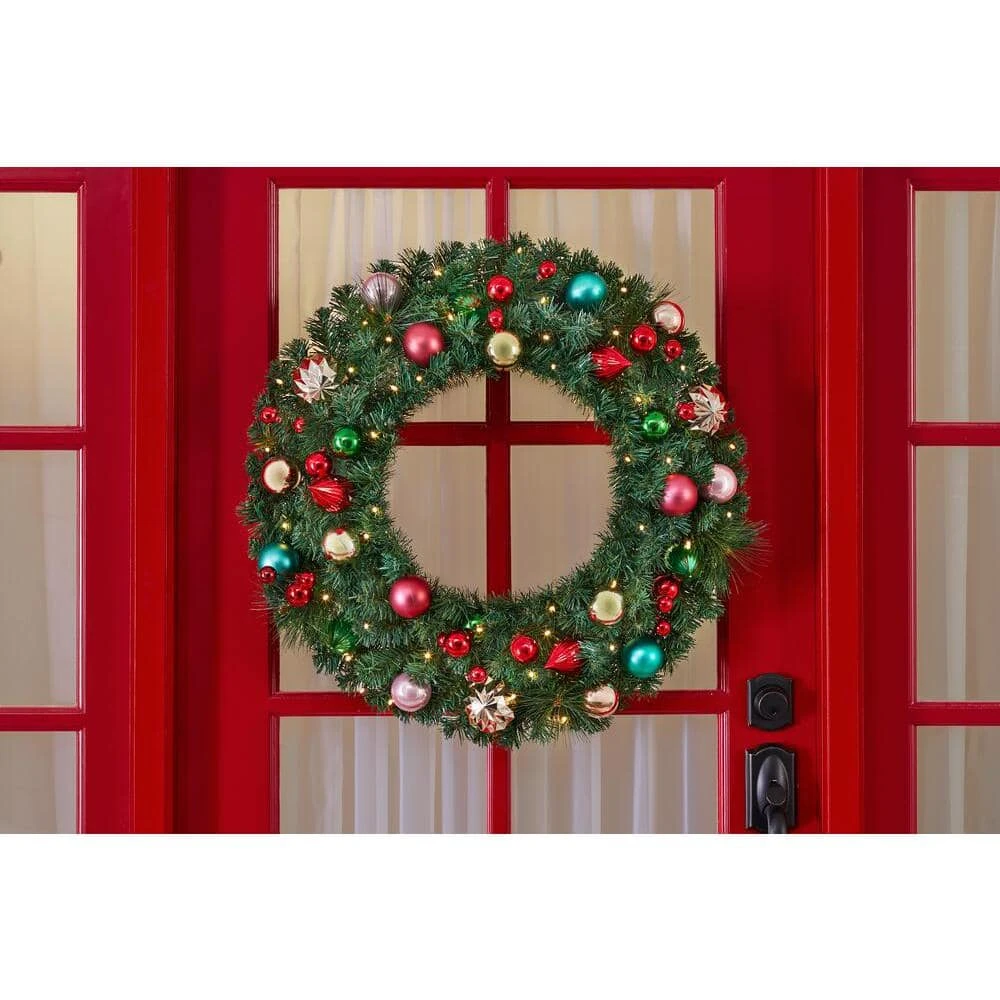 Whether you place this wreath indoors or outdoors covered, it is a cheerful addition to your Christmas decor with its 50 warm white lights. The 30 in. nutcracker wreath features cedar, red and gold plated balls, nutcracker and a plaid ribbon. Place it on the wall, door or window as a centerpiece and simply add batteries. The pre-wired 50 LED bulbs cast a warm white glow for festive sparkle and shine, while the inline timer lets you easily schedule the lights on and off. This battery-operated pre-lit LED Nutcracker artificial Christmas wreath requires 4 AA batteries for effortless, cable-free operation.