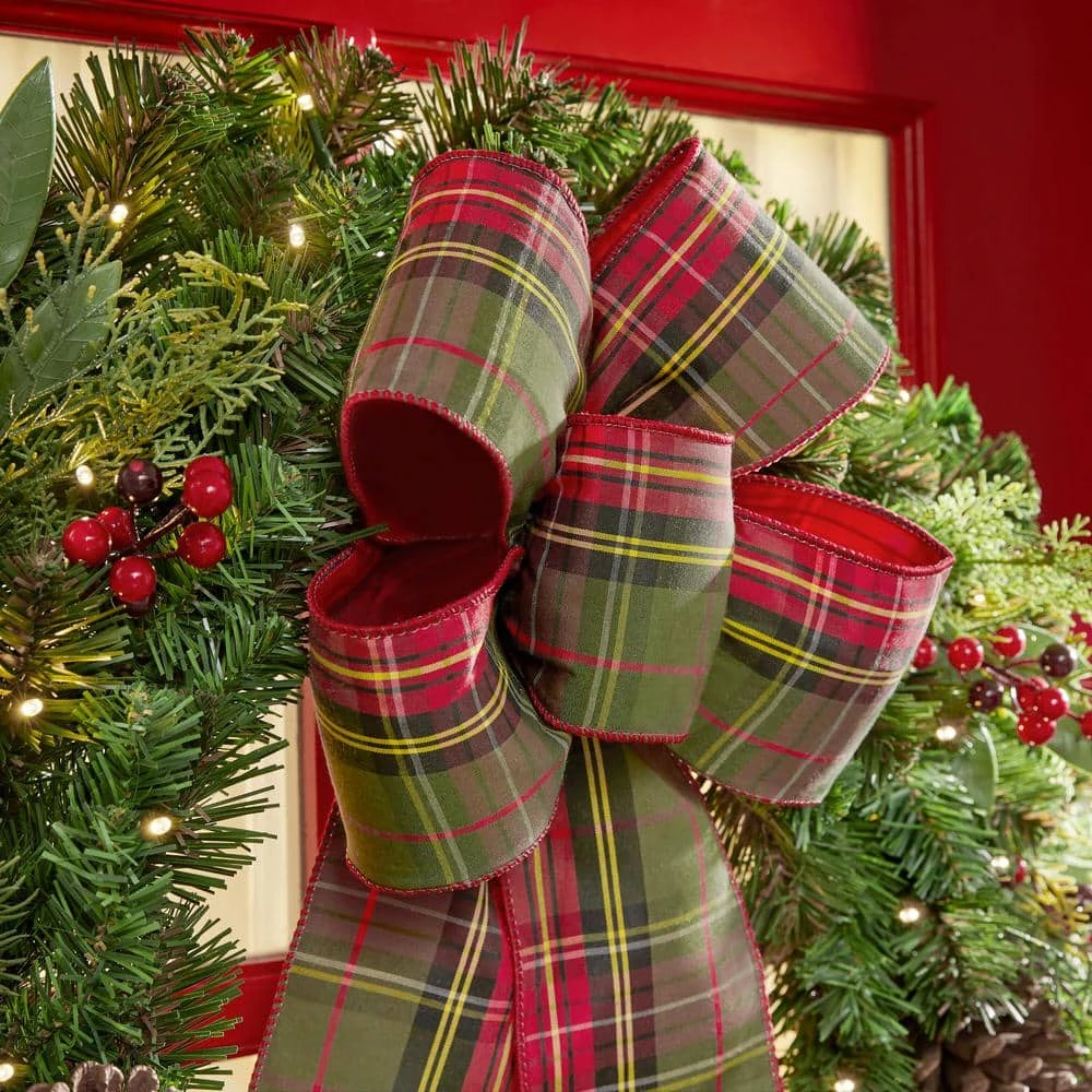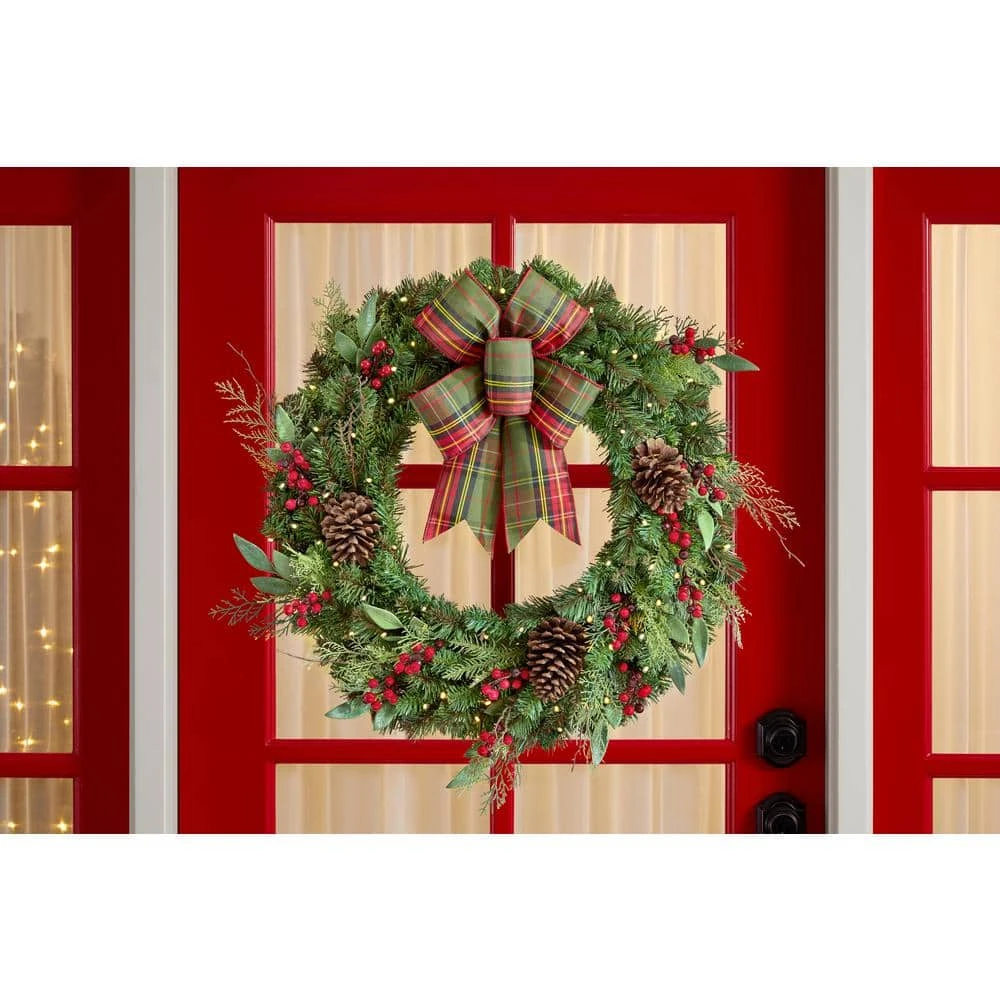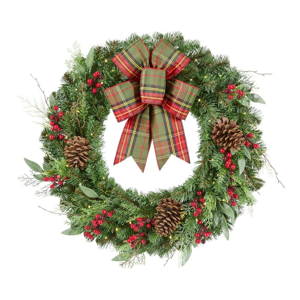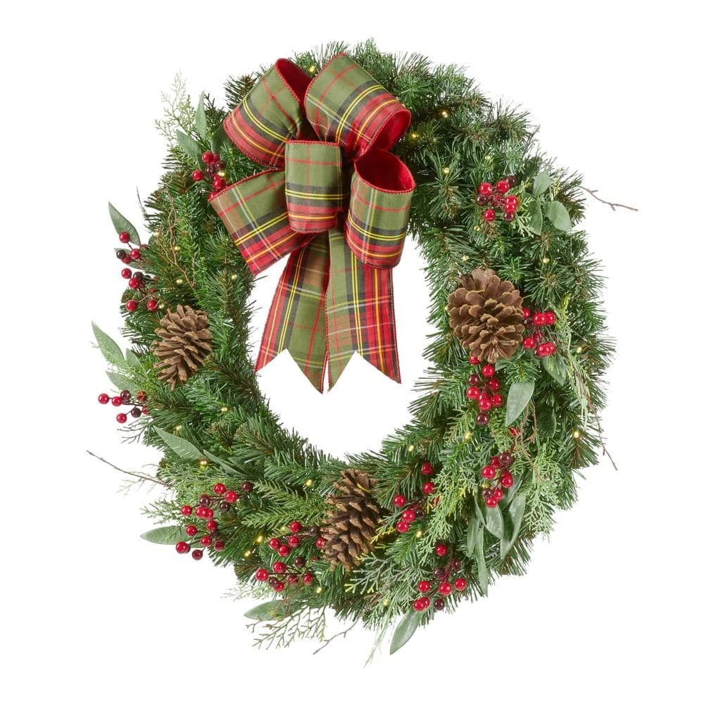 Hail the holidays and your guests with this 30-inch Woodmore mixed-pine wreath. The warm light of 50 LEDs creates subtle illumination to punctuate your seasonal celebrations, while the battery-operated design supports a range of placement options. A built-in timer provides energy-efficient operation throughout the yuletide season. Featuring pine cones and ornaments and finished with a classic plaid bow, this Woodmore mixed-pine wreath offers a charming rustic touch to add to your mantel or door.