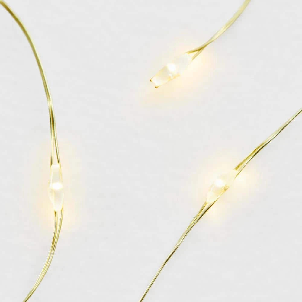 Usher in the brightest and happiest season of all with this 9 ft. 36-light gold micro dot LED string. The 36 pre-strung warm white lights deliver a cozy and festive glow, transforming the ambience in your living room. An ultra-slim golden wire enhances a luxurious holiday display, while an inline timer lets you easily automate on/off functions. Featuring a battery-operated design, this 36-light gold micro dot LED string allows for cord-free placement along the banister, mantelpiece or windowsill.
