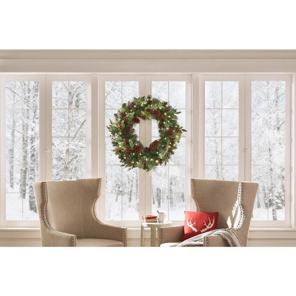 Greet guests to your home during the holidays with this prelit mixed pine wreath. Pine cones, leaves and red berries channel the beauty of nature, while the 70 warm white LEDs bring a twinkle to your front door. A battery-operated design eliminates the need for cords and plugs, supporting versatile placement in your home or on a covered porch. With lush, lifelike greenery, this pre-lit mixed pine wreath creates a lifelike look to dress up your front door or to create a focal point above the fireplace.