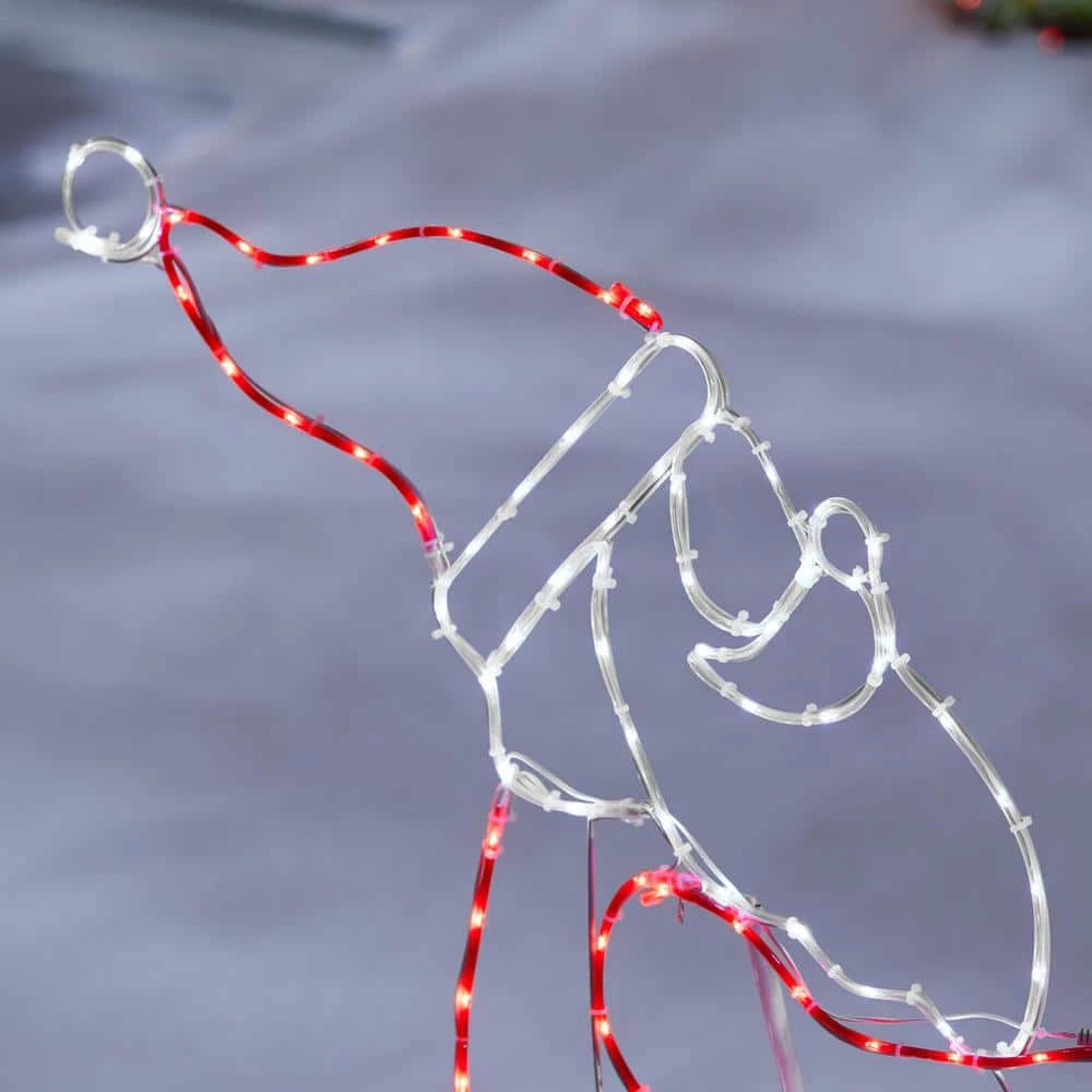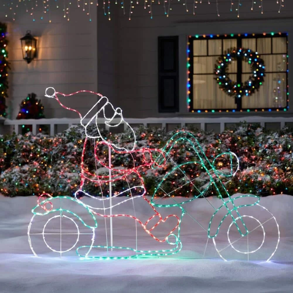 Charm your guests with this 48-inch wire tube Santa Claus in motorcycle light-up silhouette. Father Christmas exchanges his sleigh for a motorbike to give your holiday display a quirky twist. A sturdy metal frame and acrylic construction ensure durability, while the array of 415 cool multicolor LEDs keeps your home sparkling throughout the season. Secure your outdoor installation with the included stake and stand. This wire tube Santa Claus in motorcycle light-up silhouette suits indoor and outdoor areas, allowing for flexible placement on your porch or dining room.
