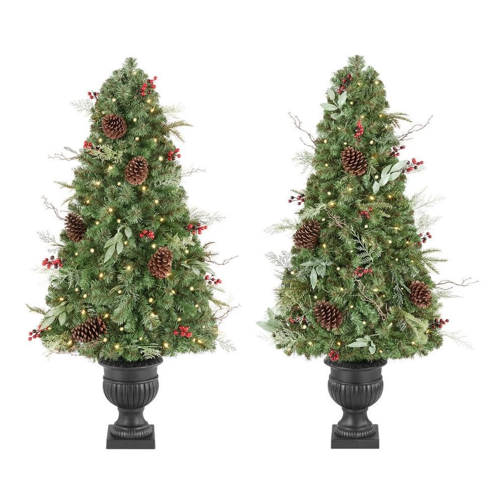 Accent your holiday decor with this set of two Woodmore pre-lit artificial Christmas trees. Decorative black pots eliminate the need for tree skirts and stands, creating an instant decoration for your home. Pine cones and red berries deliver a classic look, while the red bows add a festive finishing touch. This pair makes a perfect addition to a front foyer or covered porch, creating a warm, welcoming vibe for seasonal celebrations. With 70 warm white lights on each piece, these Woodmore pre-lit artificial Christmas trees twinkle through the night.