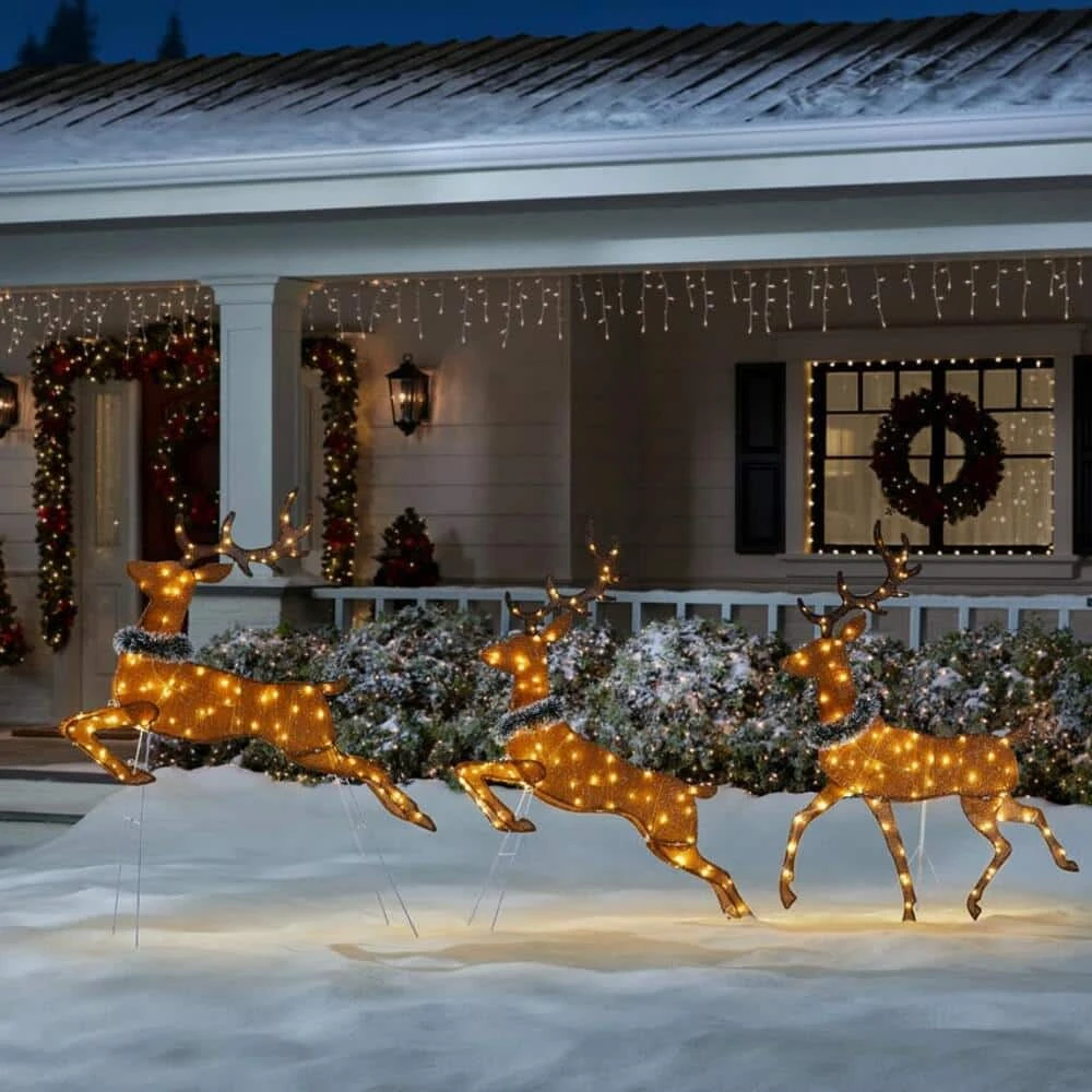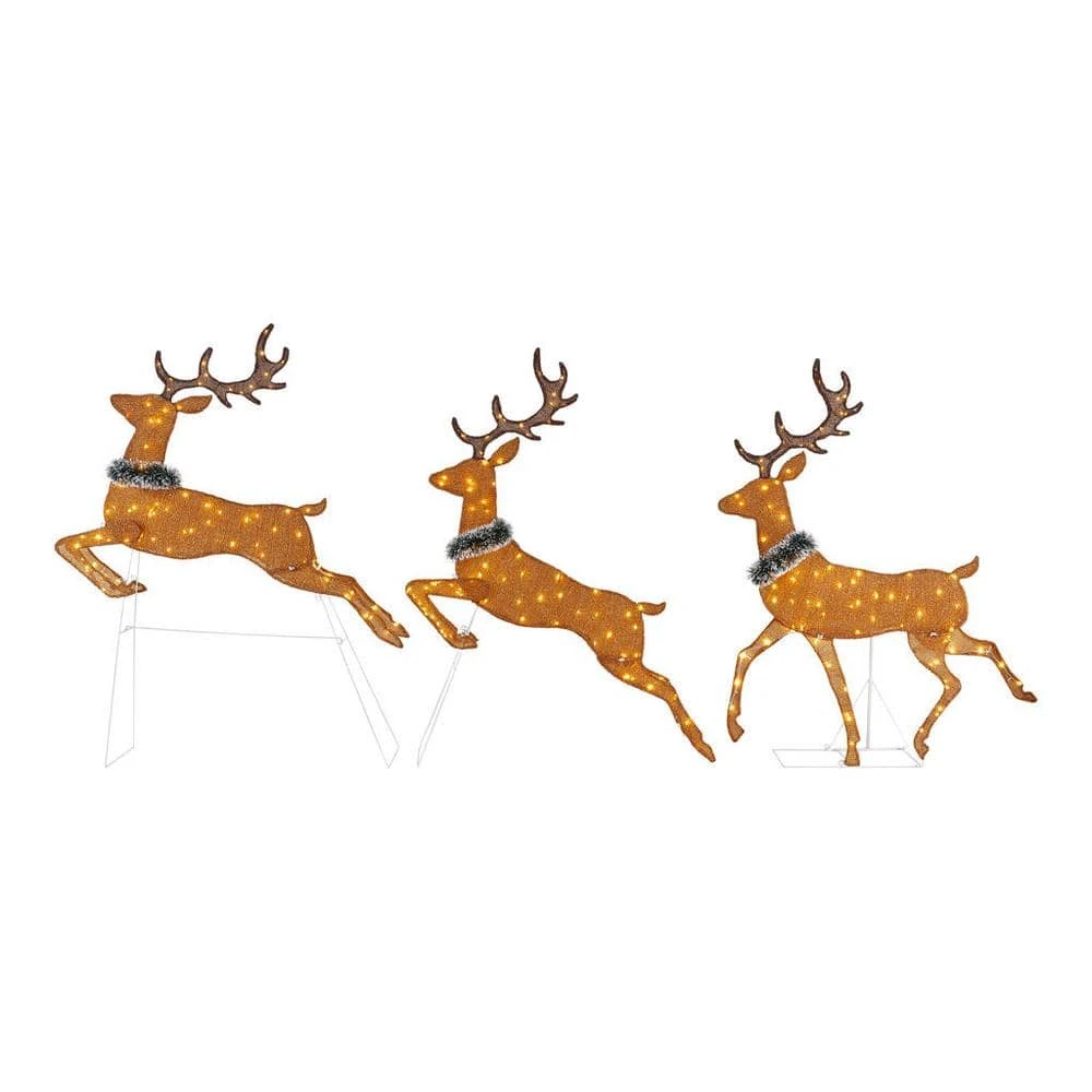 - Includes a set of three light-up leaping brown deer with extra bulbs and fuses