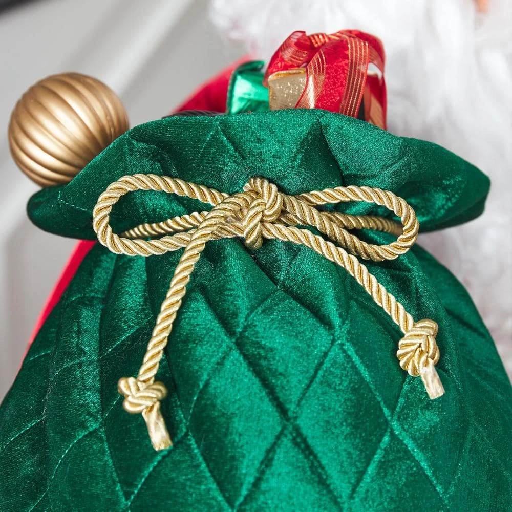 Charm your friends and family with this animated Santa greeter decorative figure. The jolly character sings joyful carols and tells stories, delivering enchanting entertainment at your holiday get-together. A motion sensor activates the audio, turning head and moving mouth to surprise and delight your guests, while the adapter-powered design keeps your home filled with merriment and delight. Dressed in a luxurious fabric outfit, this animated Santa greeter decorative figure wears a full beard and holds a plush sack for a realistic seasonal addition to your foyer or living room.
