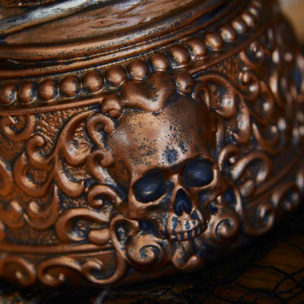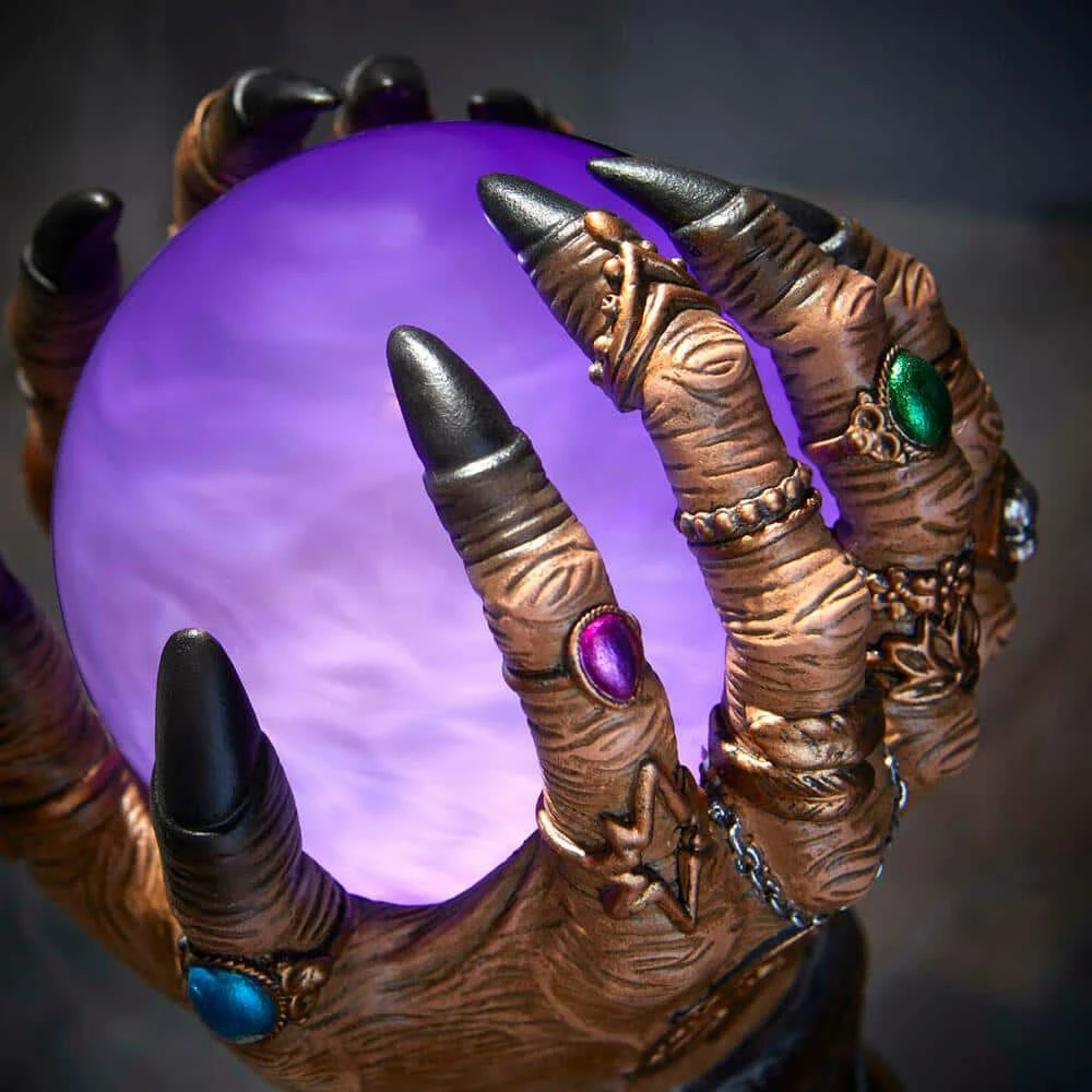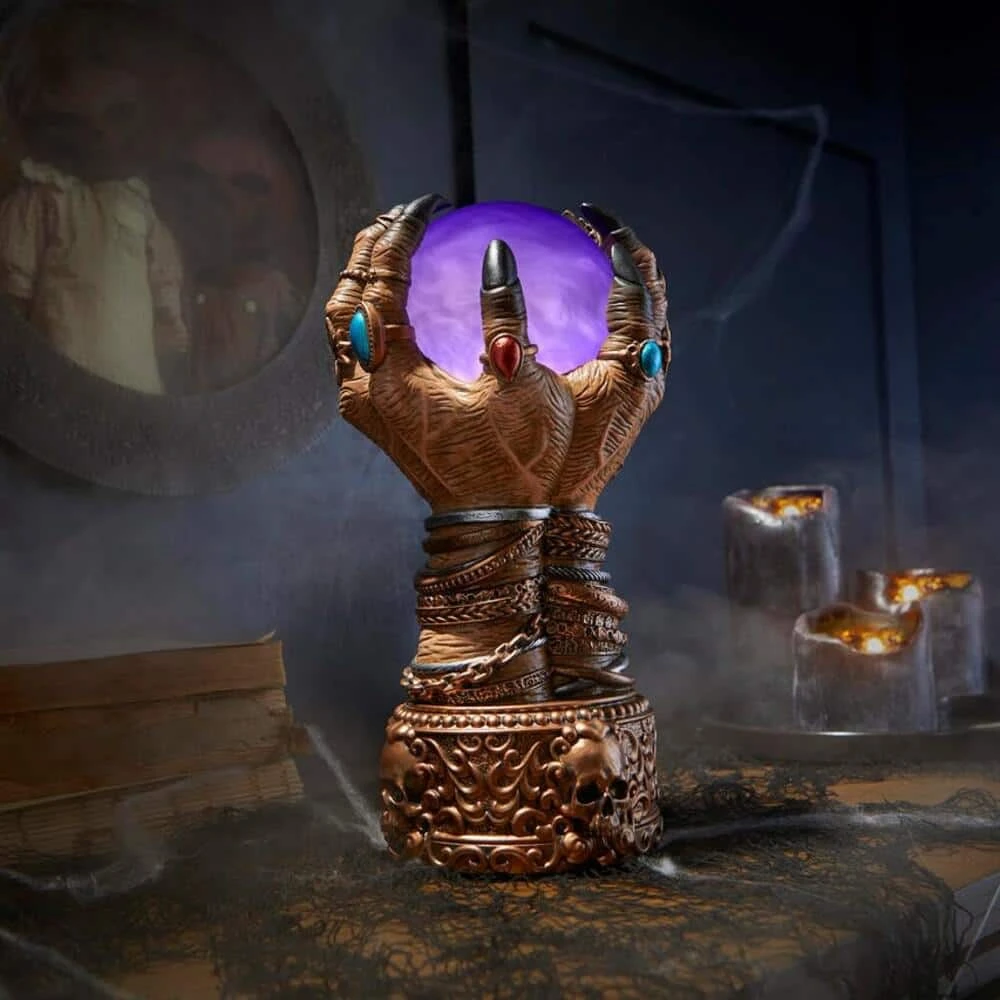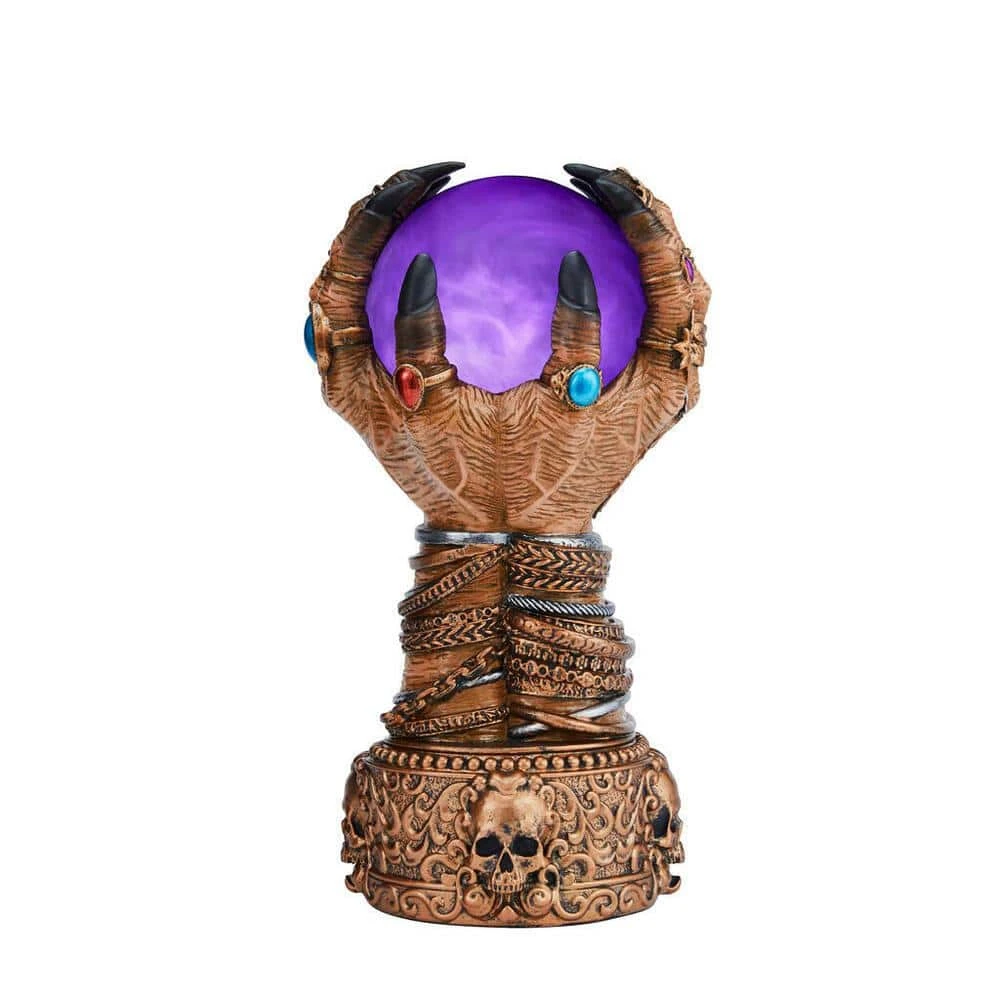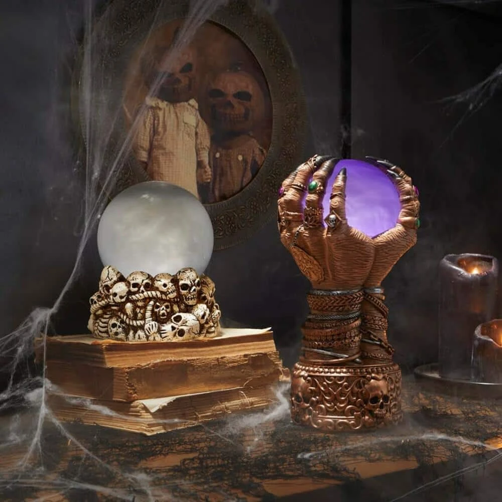 Transform your tablescape and delight Halloween dinner guests with this 9.5-inch smoky ball in hands. Clasping the orb, artistically painted claw-like hands present an otherworldly look, giving off a sinister vibe. The blue orb emits a smoky haze for a terrifying ambience, while the bright LED glow adds a hint of illumination to amp up the mystery. This battery-powered smoky ball in hands features tiny skull carvings along the base to add a spine-tingling effect.