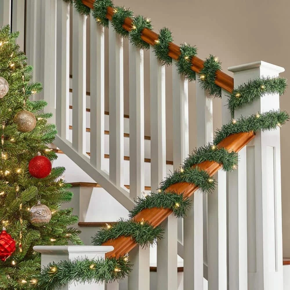 - Pre-lit artificial fir garland enhances your home’s curb appeal